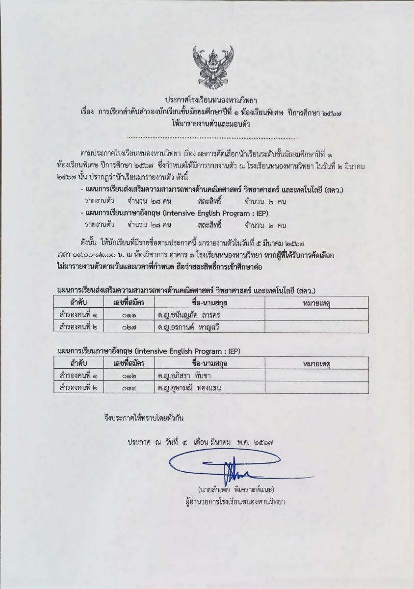 ประกาศการเรียกลำดับสำรองนักเรียนชั้น ม.1 ห้องเรียนพิเศษ ประจำปีการศึกษา 2567