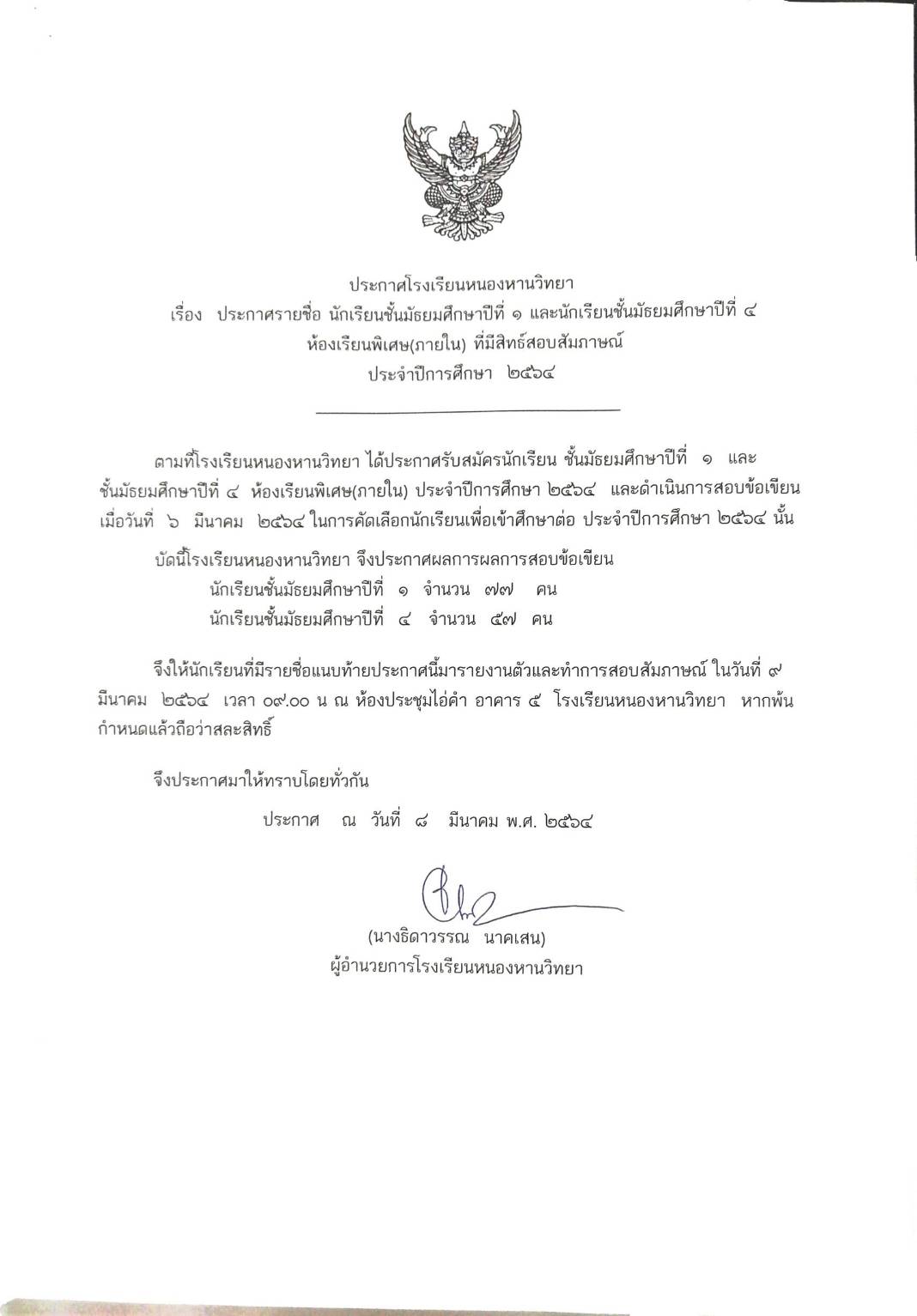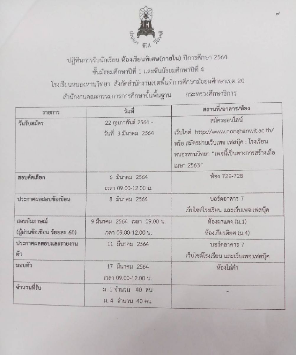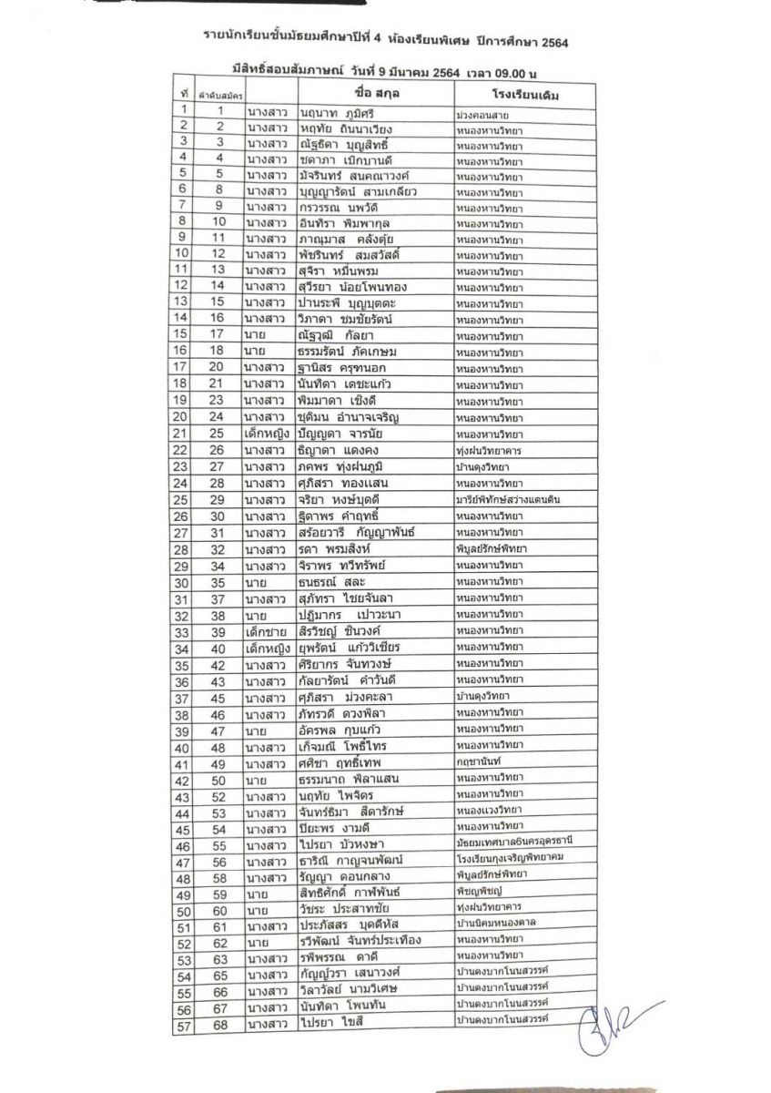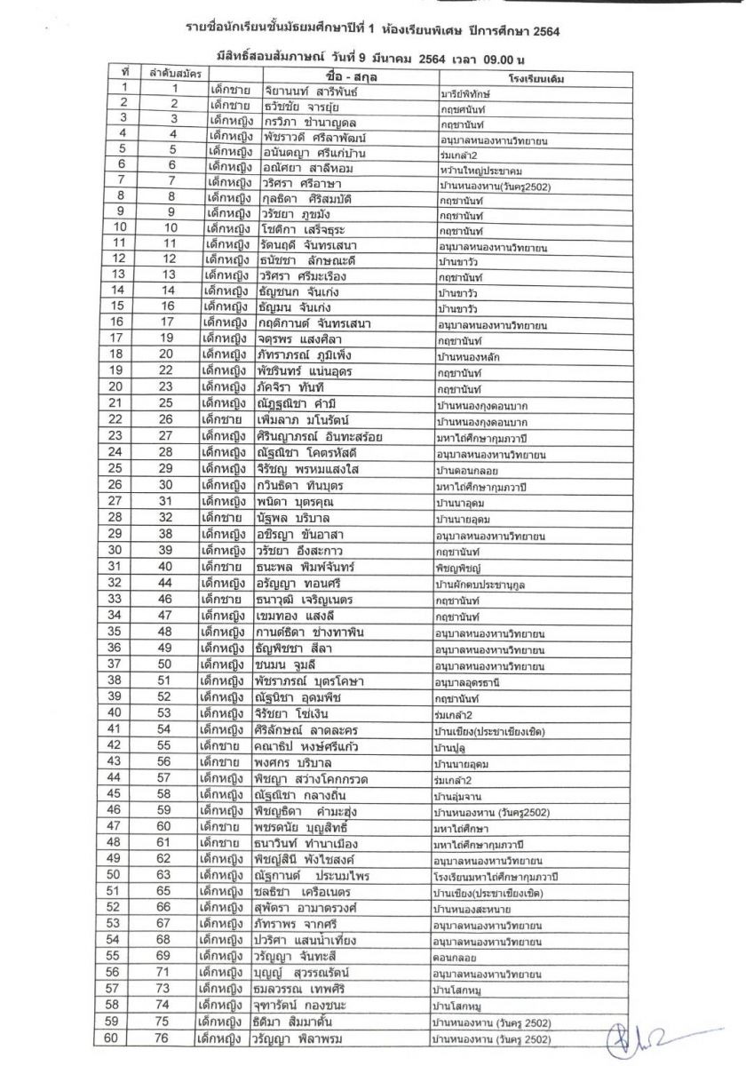 ประกาศ รายชื่อผู้มีสิทธิ์สอบสัมภาษณ์ห้องพิเศษ ม.1 และ ม.4 ปีการศึกษา 2564