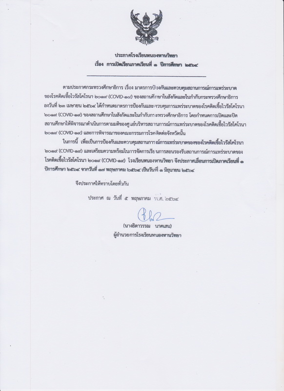 ประกาศการเปิดเรียนภาคเรียนที่ 1 ปีการศึกษา 2564