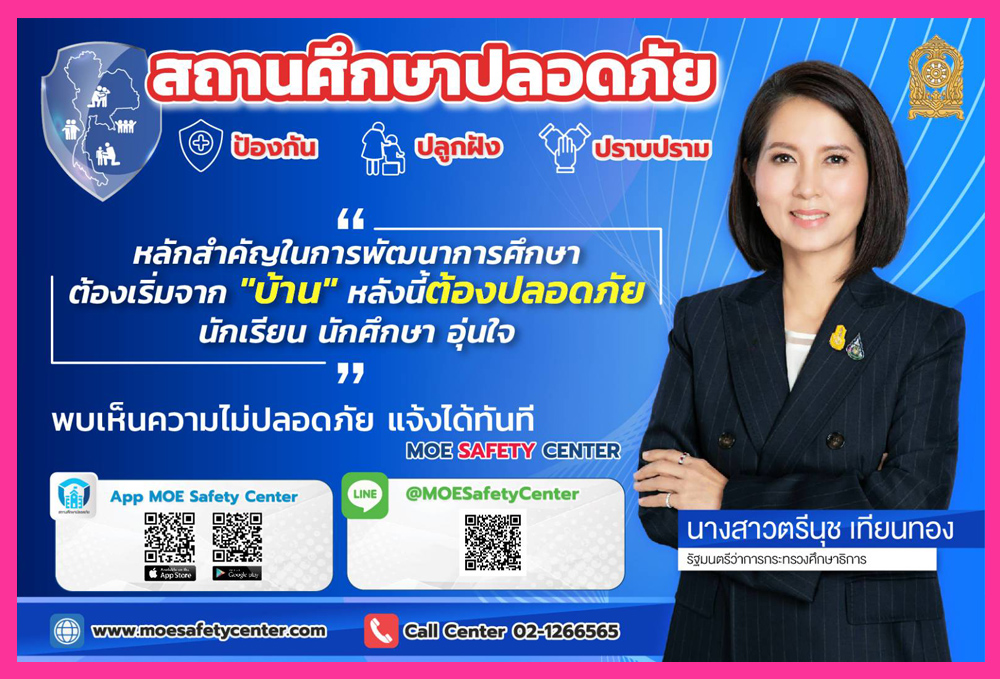 ประชาสัมพันธ์ช่องทางการแจ้งเหตุผ่านระบบ MOE-Safety-Center ซึ่งเป็นระบบมาตรฐานความปลอดภัยในสถานศึกษาโดยใช้หลัก Digital Based